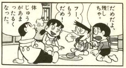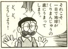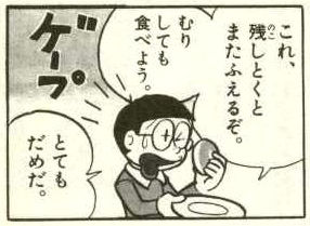 ドラえもんは呆れたのか立ち去り、のび太一人、パクパクとくり饅頭を食べます。