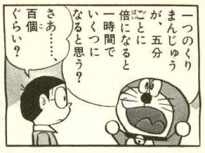 5分ごとに1個が2個、2個が4個と2乗倍に増えていく。