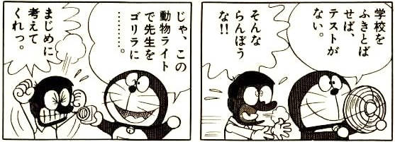 この次のコマで「ふだん、勉強しないのがいけないんだっ。」と真面目に説教してますが、大全集など初出掲載リストからドラえもんを読んでいるようなファンにとっては信用ならない真面目さ。家の中でボーリングしたりしますもん、こいつ。