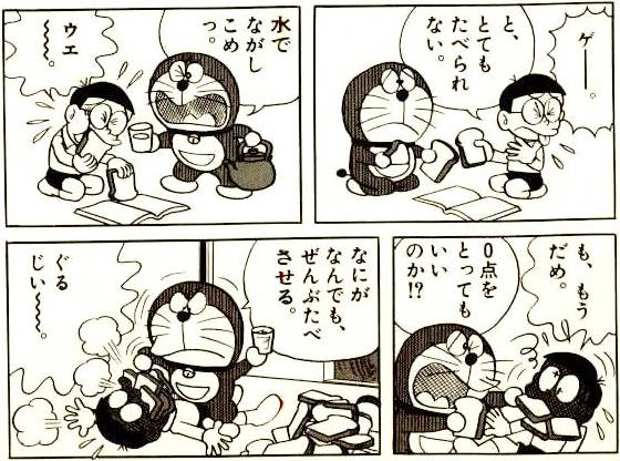 そのでかいパンを無理矢理のび太に押しこんでるドラえもん。押しこんでるだけならいいが、押しこんでるドラ本人は無茶苦茶顔が白けてる。